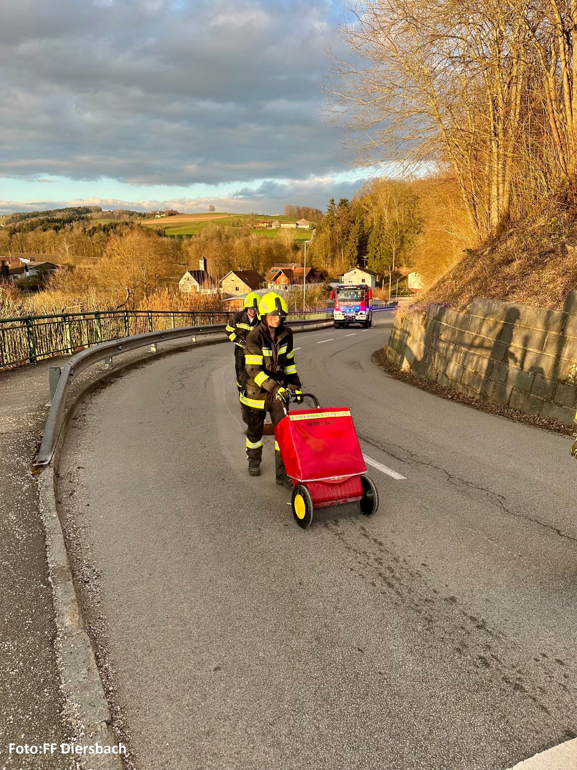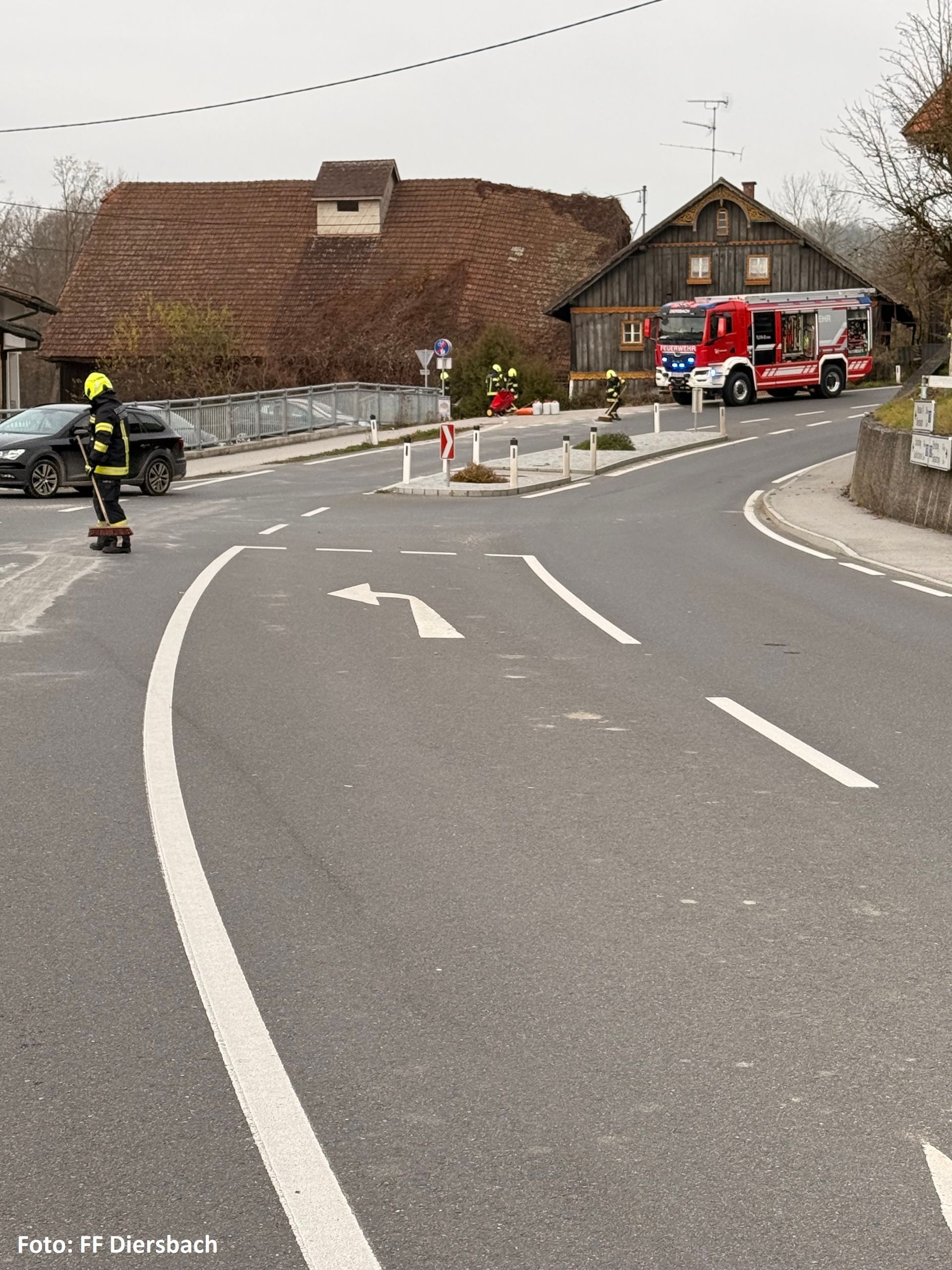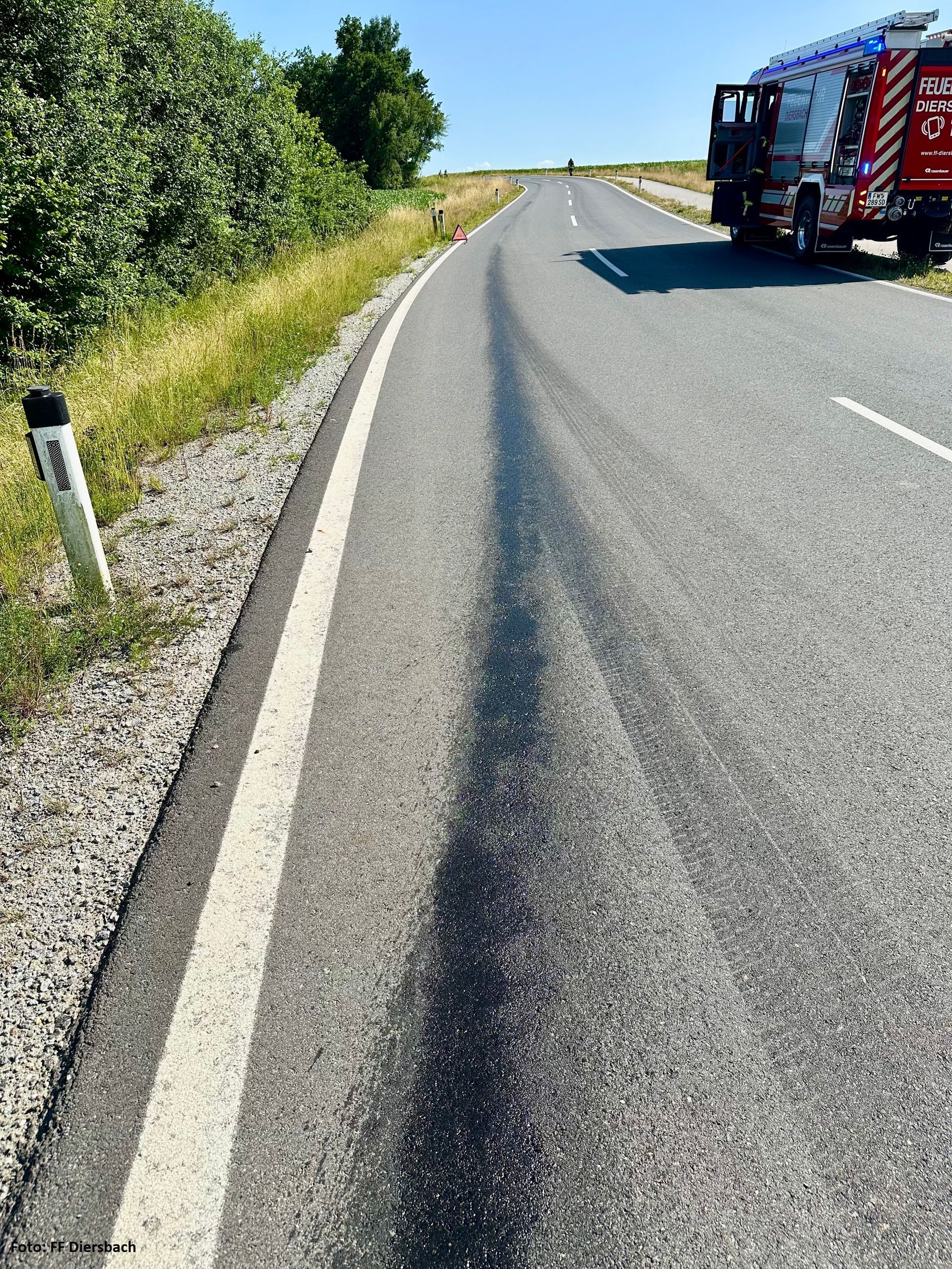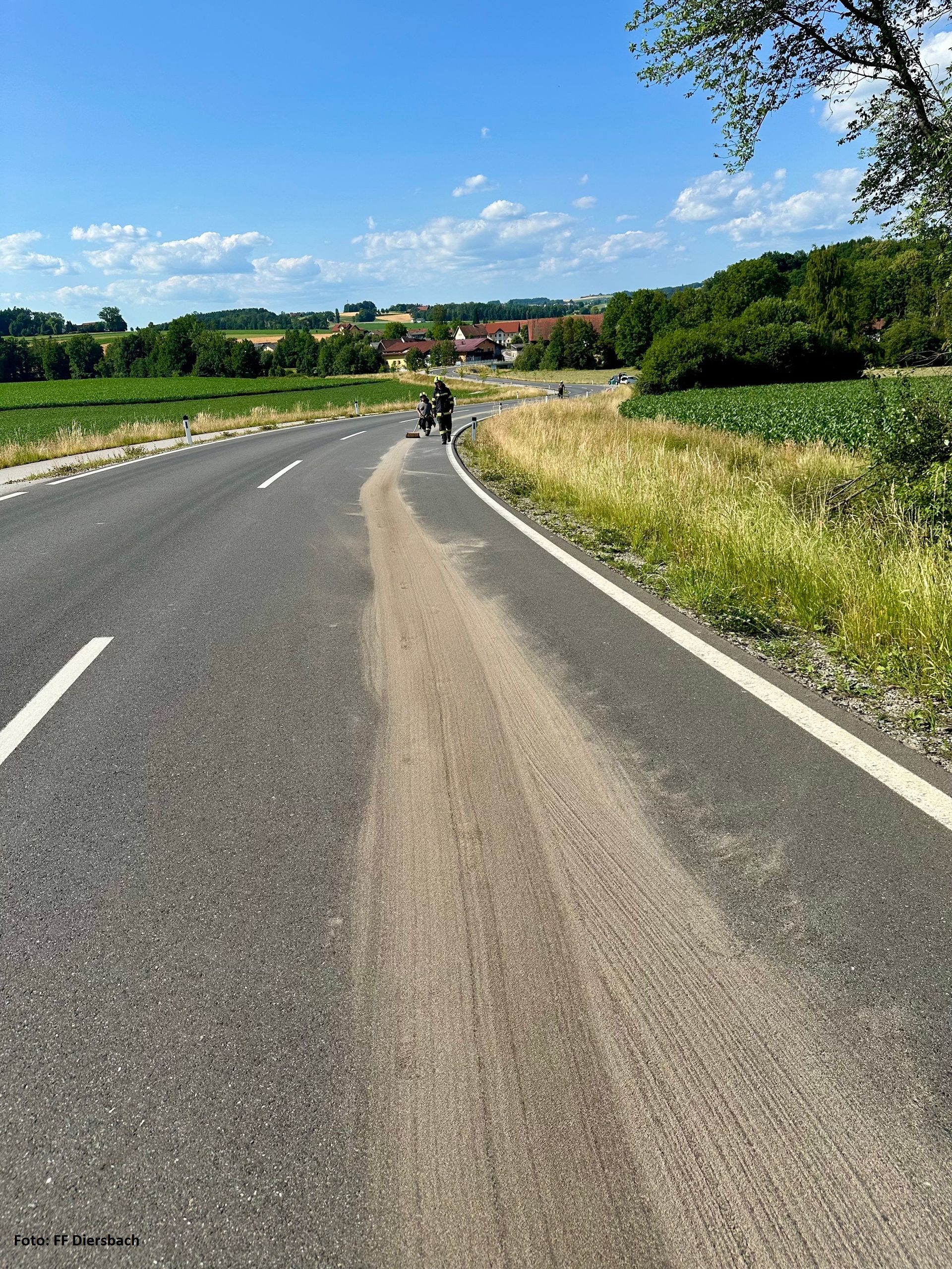 Die FF Diersbach sicherte die Straße mit Lotsen und Ölspurtafeln. Die über 2 km lange Dieselspur wurde mit Ölbindemittel gebunden.