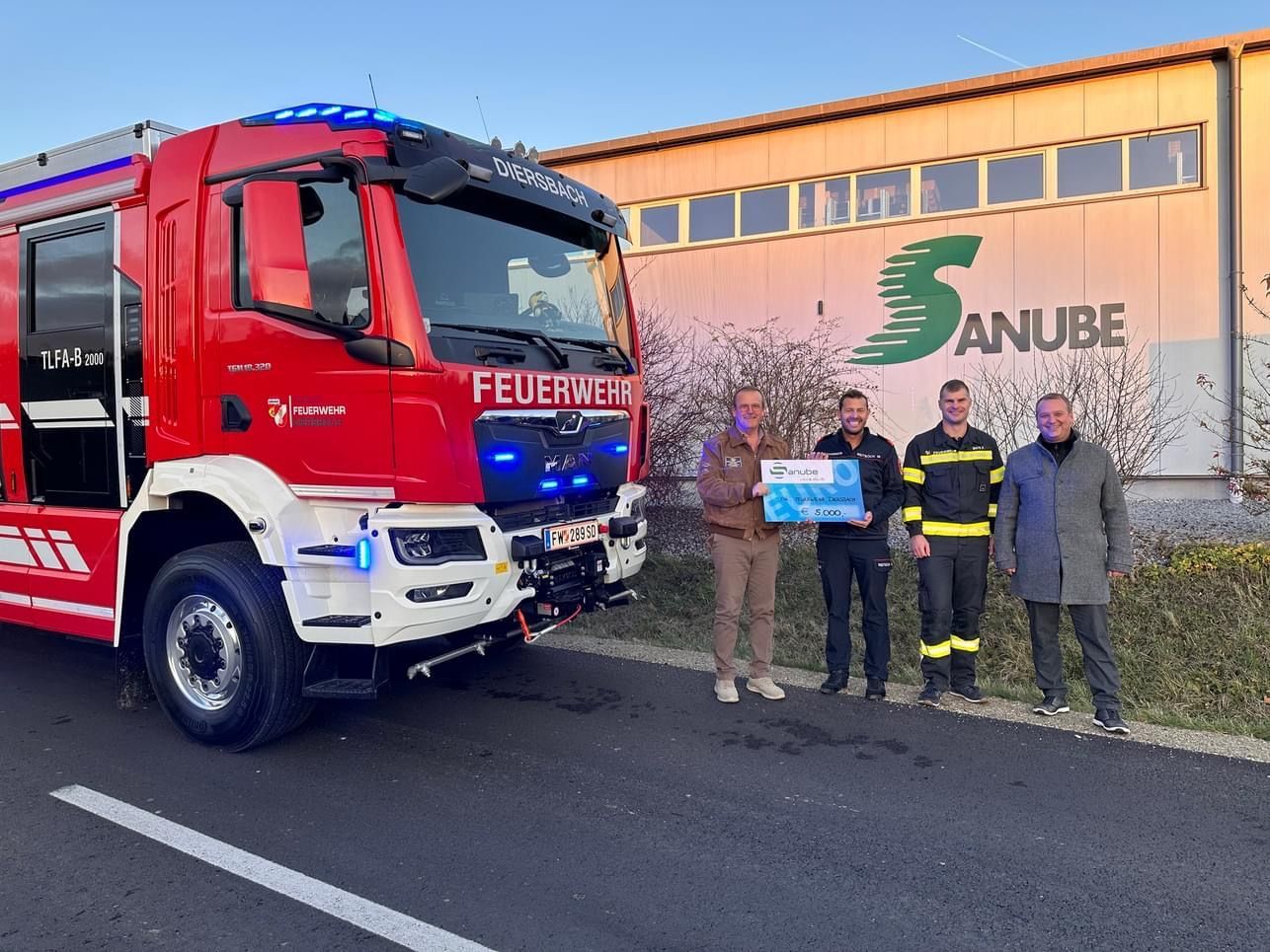 Am Donnerstag, den 23.11.2023 überreichten die Sanube-Geschäftsleiter Walter und Stefan Sallaberger der Freiwilligen Feuerwehr Diersbach, Kommandant HBI Wolfgang Reitböck und Schriftführer BI d.F. Florian Mayr, eine großzügige Spende von 5.000 € für ein neues Tanklöschfahrzeug TLFA-B2000.
