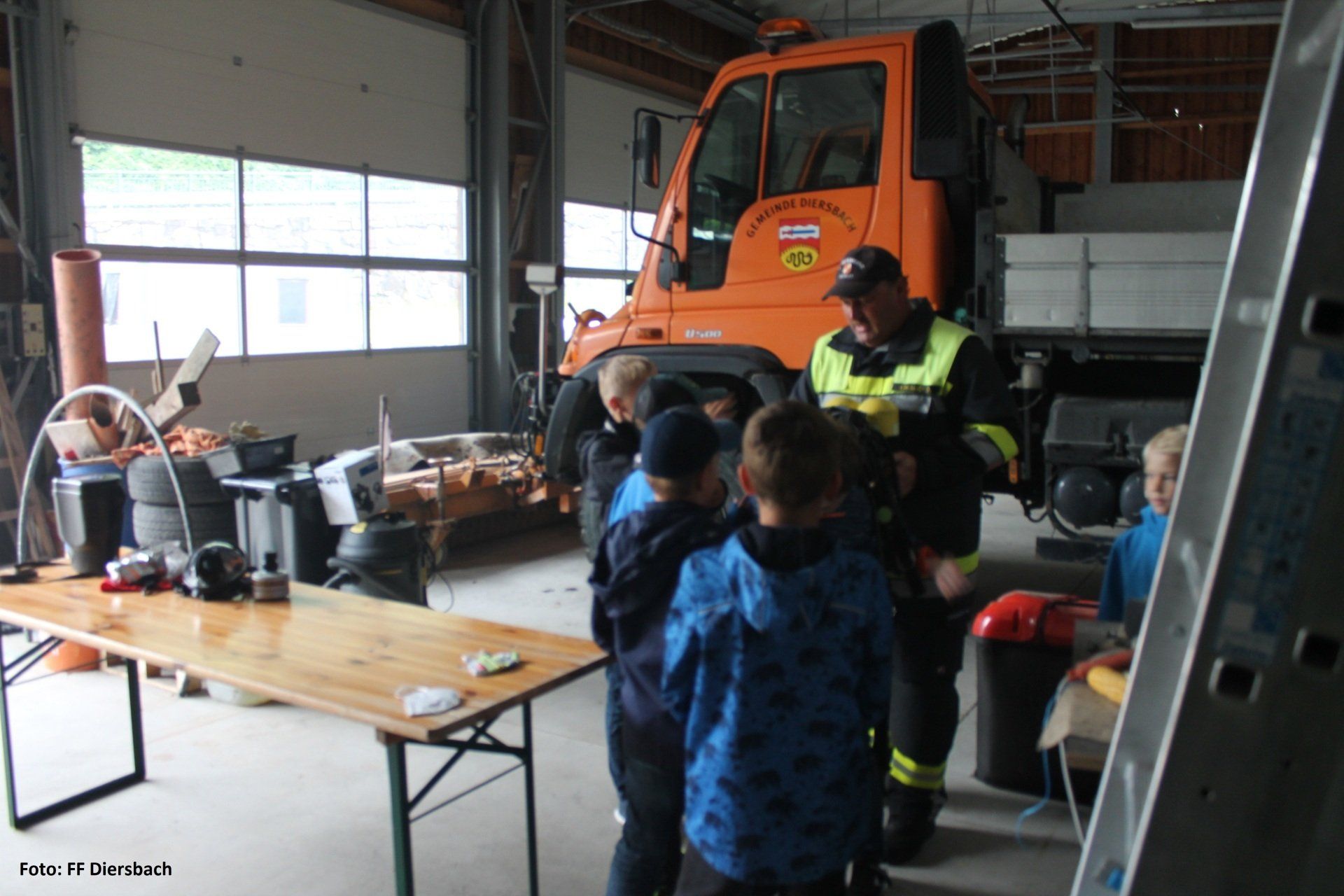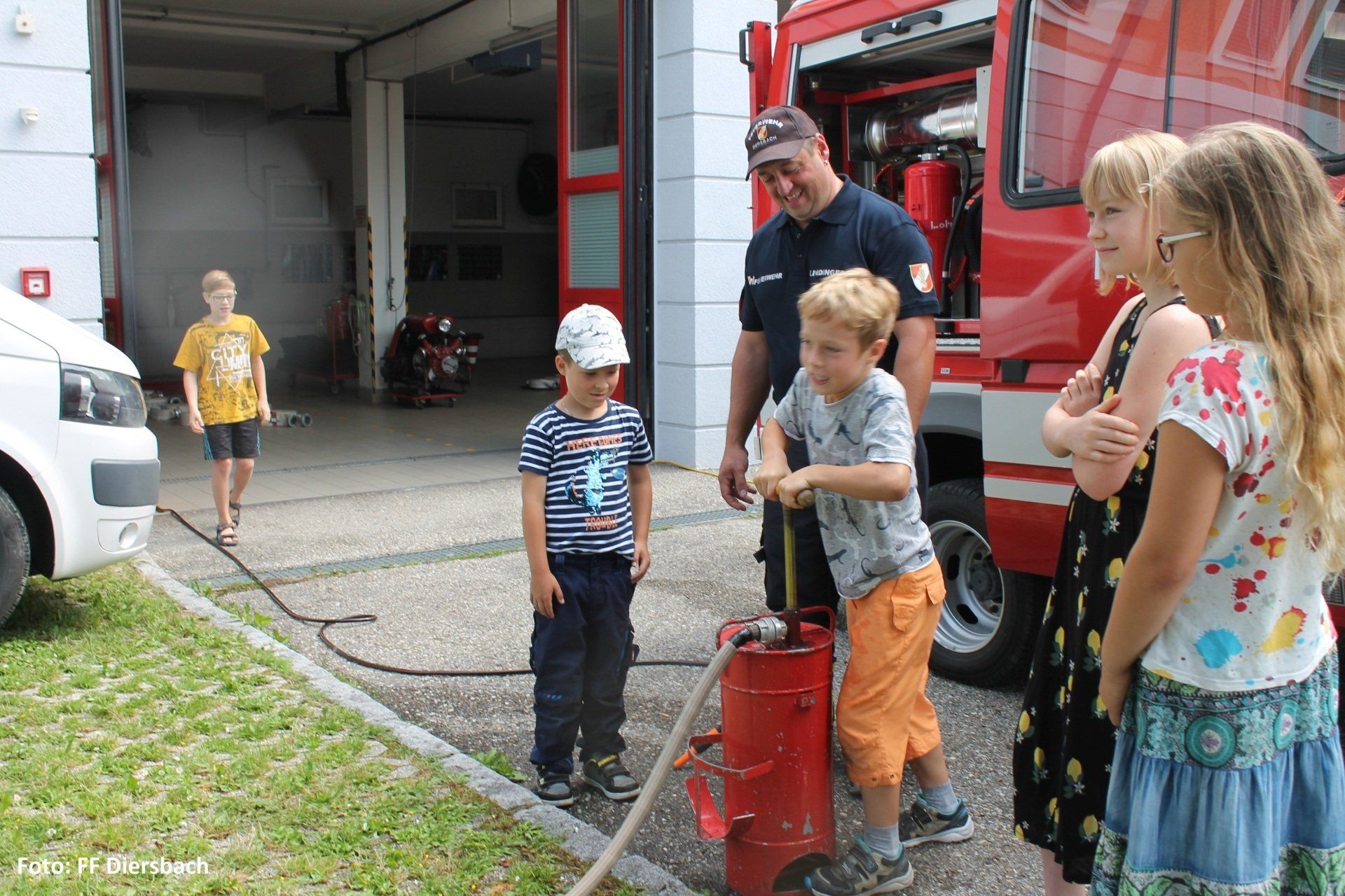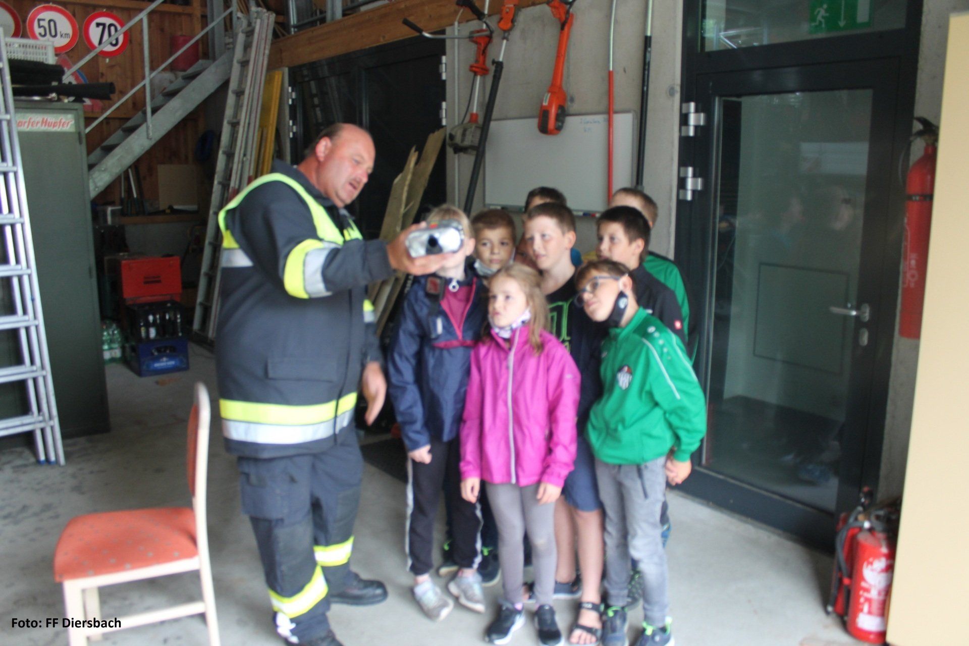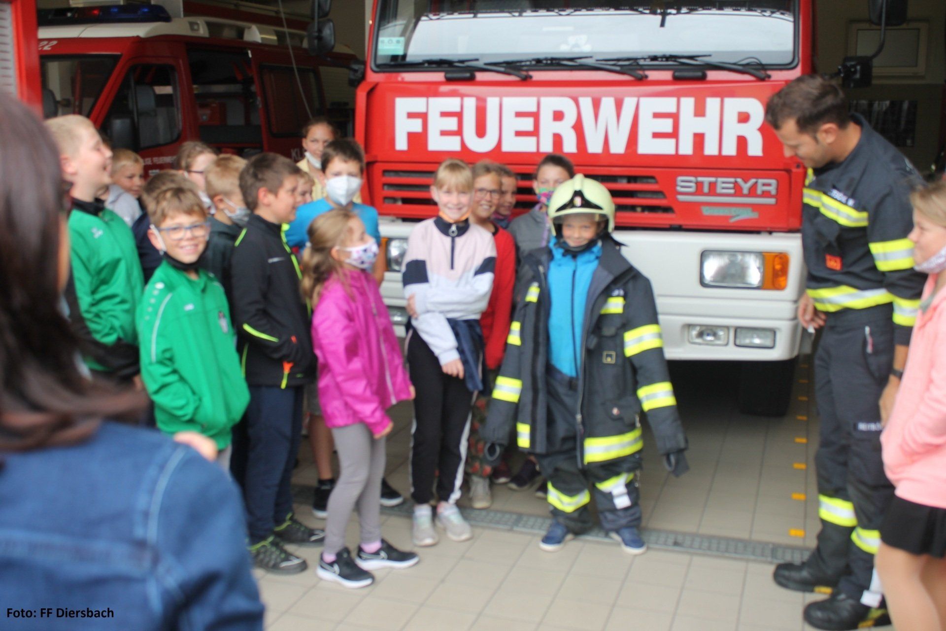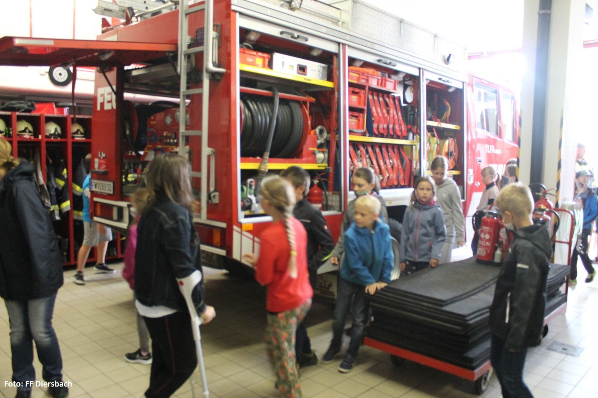 Die Kinder wurden dazu um 09:00 Uhr bei der Volksschule abgeholt. Anschließend besichtigten die Kinder das Feuerwehrhaus in Diersbach. Hier gab es einen interessanten Einblick was alles in einem Feuerwehrhaus ist und steht. Einige Kids konnten sich dazu gleich mit der Einsatzbekleidung ausrüsten und ins Feuerwehrauto steigen.