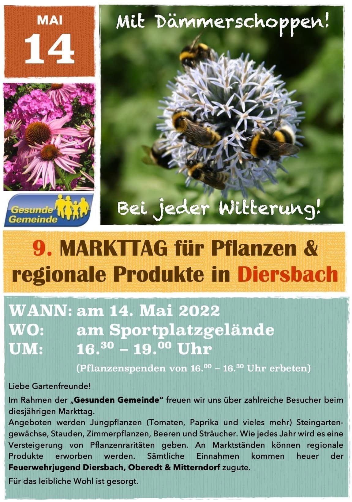 Der 9. Markttag für Pflanzen und regionale Produkte wurde von der „Gesunden Gemeinde“ am Samstag, den 14. Mai 2022 am Sportplatz in Diersbach veranstaltet.