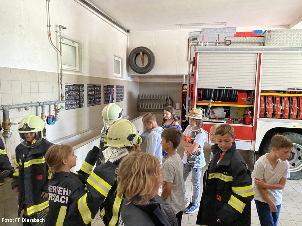 Um 10:00 Uhr ging es weiter zur Volksschule, wo die 3. und 4. Klasse abgeholt wurde. Die Kinder dieser Klassen haben sich dazu mit den Lernunterlagen "Gemeinsam.Sicher.Feuerwehr" bestens vorbereitet und waren perfekt für den Feuerwehrbesuch gewappnet. Nach einer kleinen Frage und Antwortrunde, ging es in das Feuerwehrhaus von Diersbach. Hier gab es einen interessanten Einblick was alles in einem Feuerwehrhaus ist und steht. Einige Kids konnten sich dazu gleich mit der Einsatzbekleidung ausrüsten und ins Feuerwehrauto steigen.