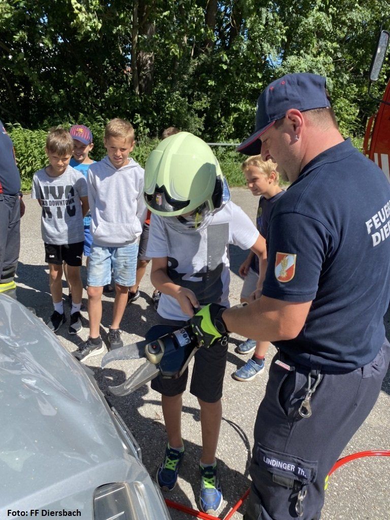 Als 2. Etappe wurden die Kinder in 3 Gruppen eingeteilt, wo es jetzt ans Anpacken geht. Mit den Feuerwehrautos der FF Diersbach, FF Mitterndorf und FF Oberedt ging es zum Bauhof, wo in den 3 Gruppen gearbeitet werden durfte. In diesen 3 Stationen wurden die wasserführenden Armaturen (Pumpen, Strahlrohre,…), das hydraulische Rettungsgerät (Bergeschere, Spreitzer,..) und der Atemschutz, Wärmebildkamera samt Ausrüstung vorgeführt. Jedes Kind hatte die hier Möglichkeit selbst anzupacken und fleißig mitzuarbeiten!